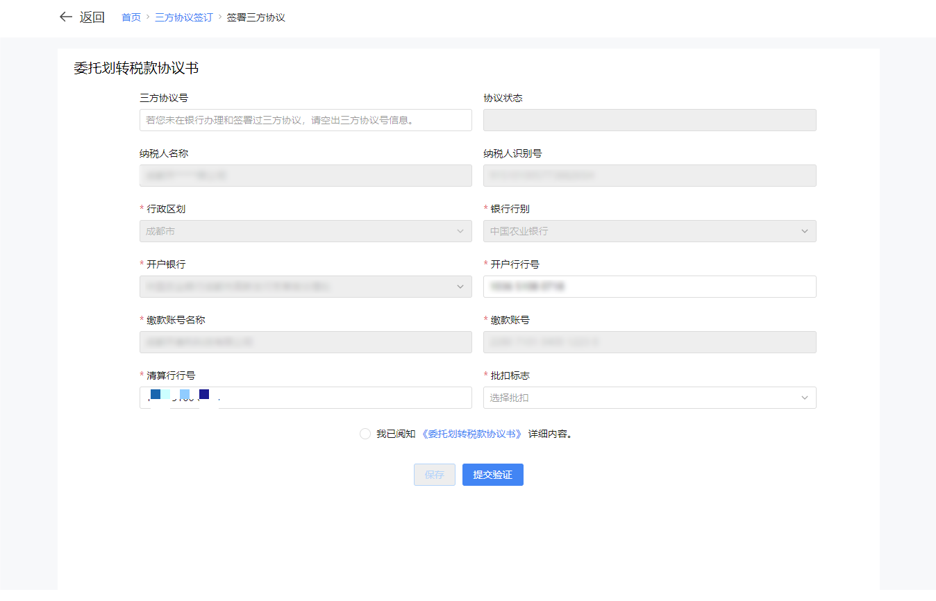 点击【立即办理银税三方(委托)划缴协议】后,可跳转至三方协议签订界面进行操作。