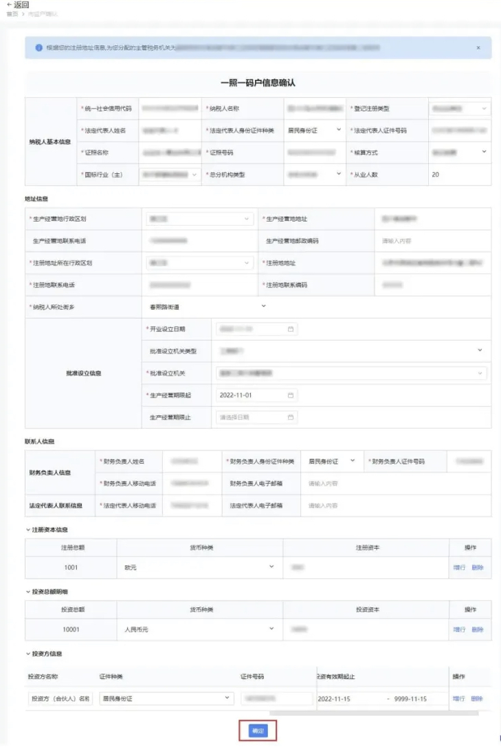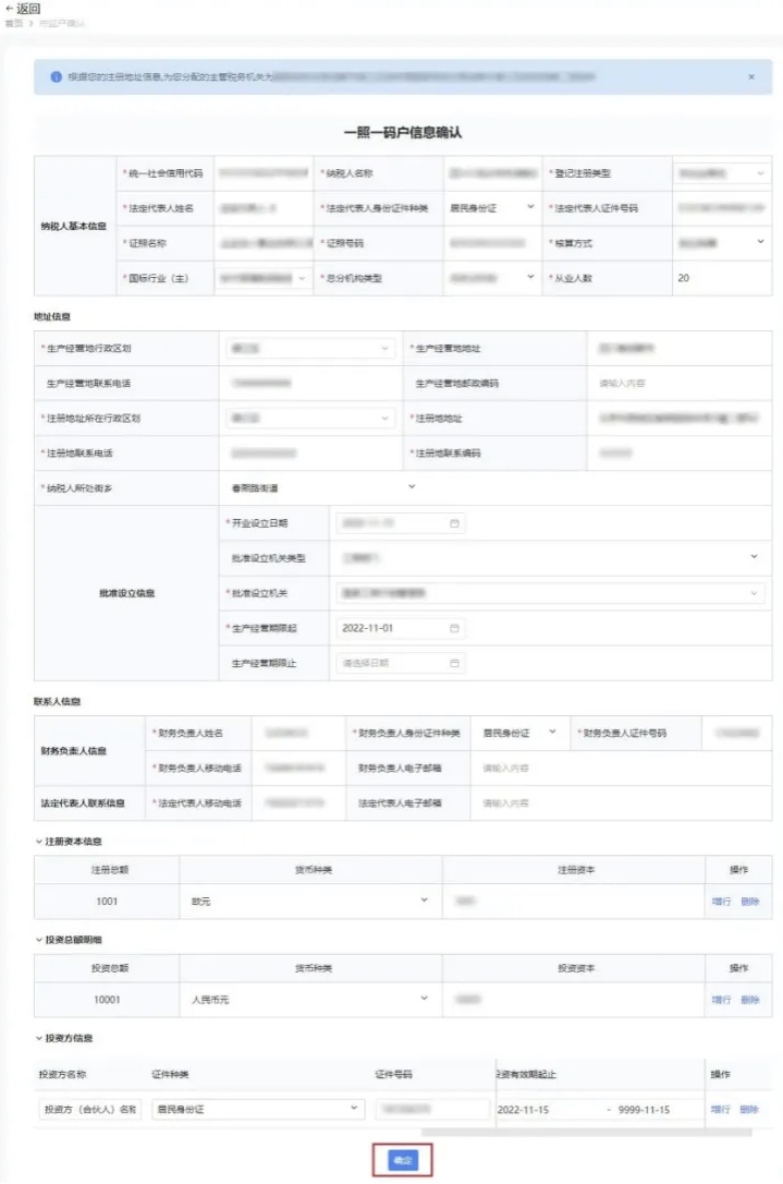 1.如纳税人已在市场监管部门办理登记,在首次办理涉税事宜时,通过此功能模块对税务机关依据外部信息交换系统获取的注册登记信息及其他税务信息进行确认。系统会自动为纳税人分配主管税务机关和主管税务所(科、分局),以及自动为其进行税费种认定。