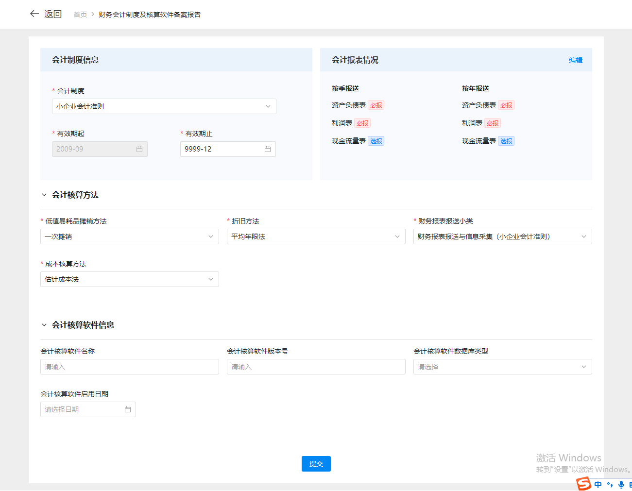 点击【提交】,系统提示“申请成功”,可下载打印《财务会计制度及核算软件备案报告书》。