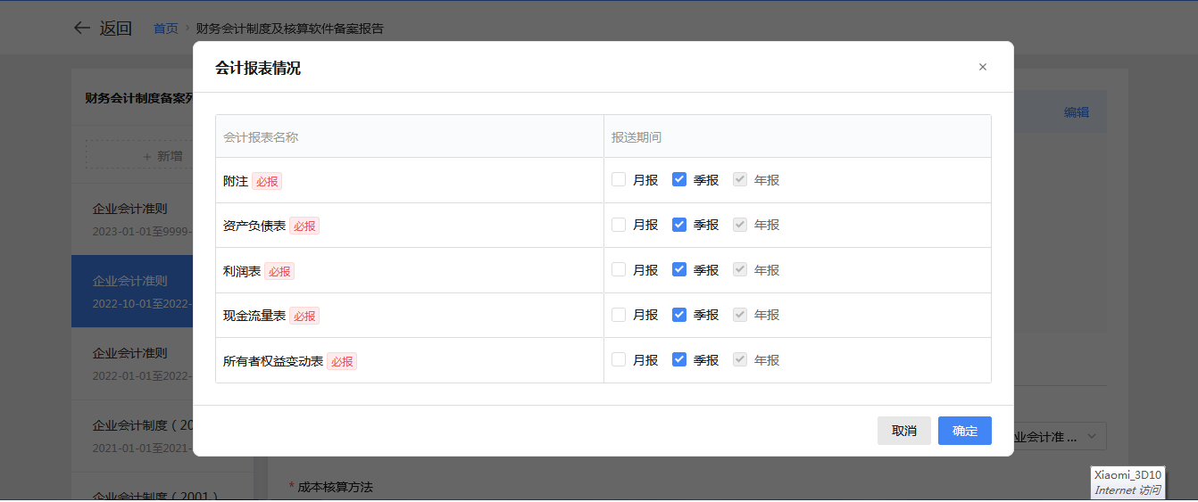 点击【会计报表情况】右上角的【编辑】,系统将根据纳税人选择的会计制度信息自动展示需要报送的会计报表类型,纳税人可选择会计报表报送期间为“月报”或“季报”,(为便于纳税人报送会计报表、减少报送次数建议选择“季报”,纳税人也可根据自身实际情况选择“月报”)。系统将自动保持必报报表报送期间一致,同时默认全选“年报”且不可修改。当会计报表报送期间选择季报时,备案报告有效期起必须选择为季初,有效期止必须选择为季末。