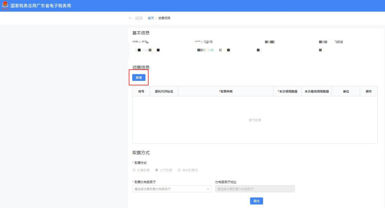 进入发票领用界面,点击【新增】,系统会自动带出纳税人已核定的有效发票票种信息,下拉选择发票种类,并填写领用数量。