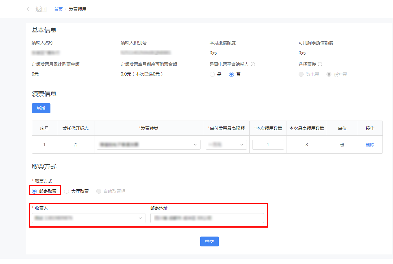 如若收票人下拉选项为空,需要先维护邮箱地址。纳税人可通过下方提示“请前往邮寄信息管理维护收票人信息”,直接进入【邮寄信息管理】模块,或通过【我要办税】-【发票使用】-【邮寄信息管理】维护邮寄地址,然后收票人下拉菜单即可带出数据。