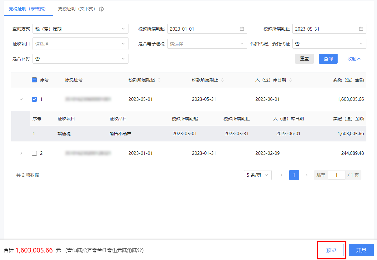 点击【查询】,显示可开具完税证明的凭证信息,勾选需要开具完税证明的凭证信息。