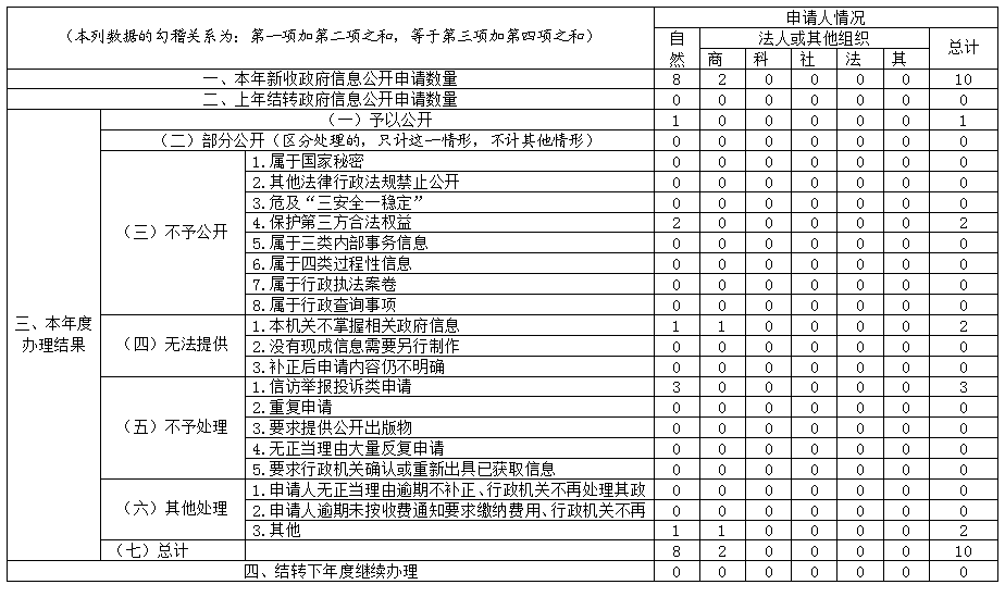 (二)依申请公开情况。依法保障申请人的合法权益,进一步规范依申请公开办理流程,认真做好依申请公开的接收、登记、办理、答复等各个环节工作,通过规范化、精细化管理,确保答复内容准确、及时、规范。对于较为复杂和涉及多部门的信息公开申请,通过引入法律咨询顾问、组织多部门合议等方式加强协调,设身处地为申请人排忧解困,不断提升群众满意度。2023年,共收到依申请公开10份,所有申请均按规定时间依法办结答复。